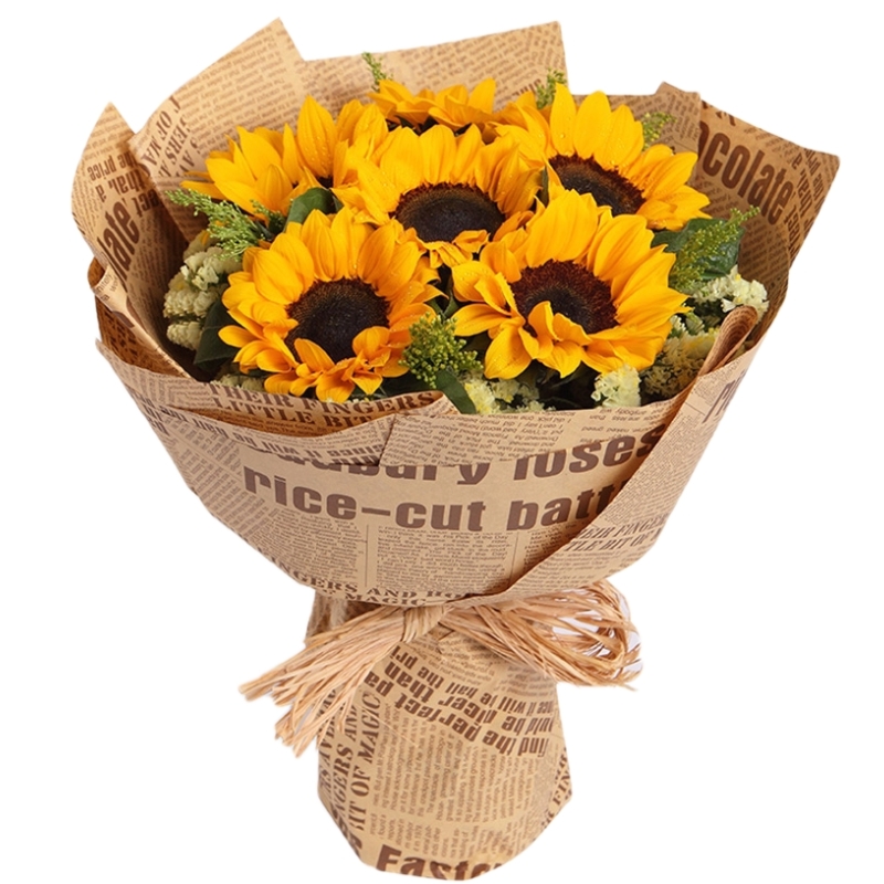 Букет состоит из 7 подсолнухов, зелень, крафт.